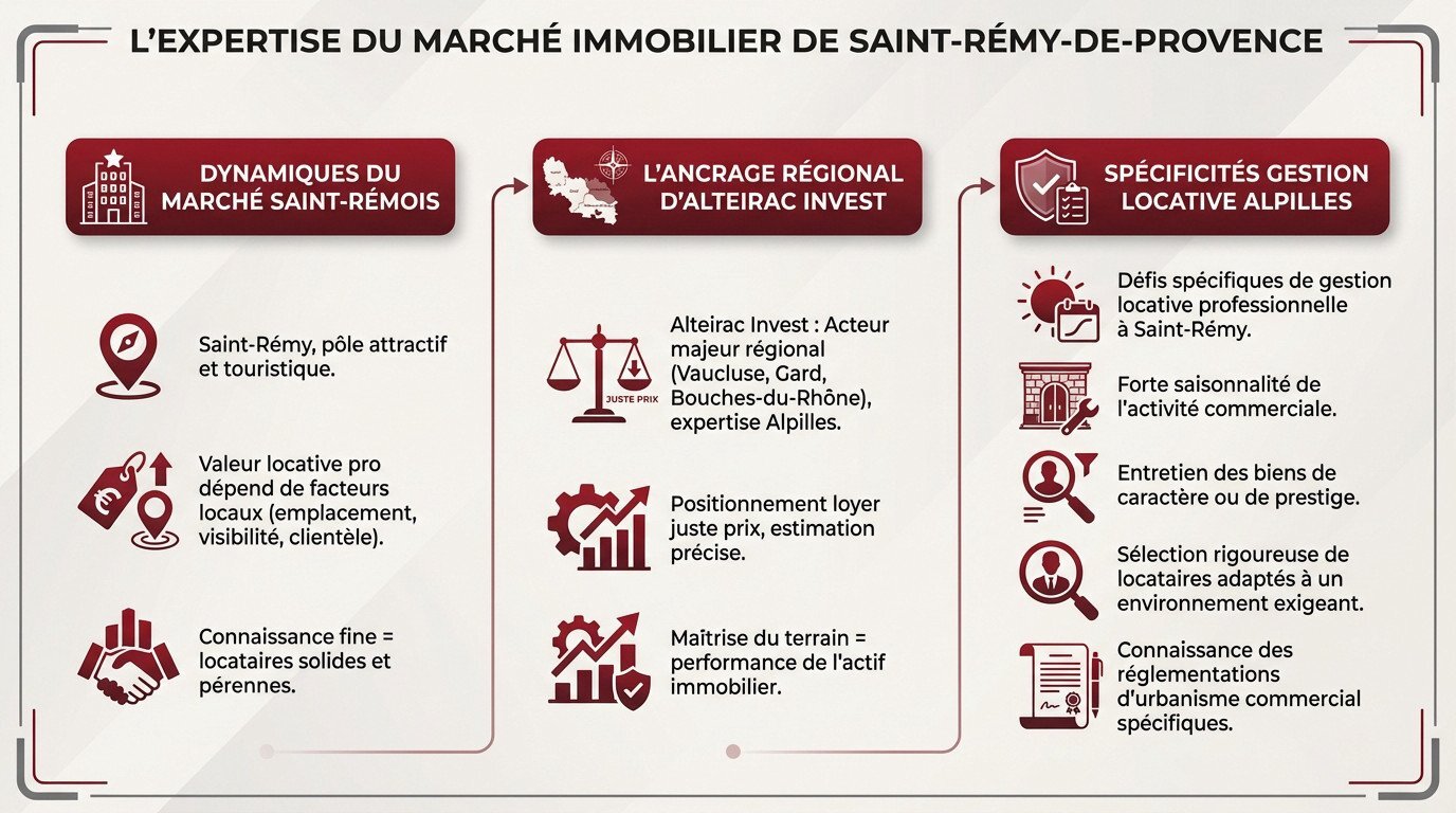 Opter pour Alteirac Invest à Saint-Rémy-de-Provence, c’est choisir la sérénité et la performance pour vos actifs professionnels. Notre expertise locale, couplée à une gestion rigoureuse, sécurise vos revenus tout en valorisant votre patrimoine sur le long terme. Déléguez les contraintes administratives et maximisez votre rentabilité grâce à un partenaire dédié à votre réussite.